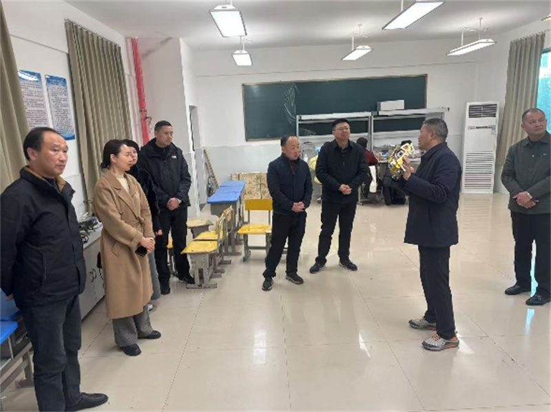 为扎实推进2026年湖北省职业院校技能大赛备赛工作,切实提升训练实效与参赛水平,12月26日上午,荆门市教育局副主任督学赵军,职成科科长李慧玲、副科长刘祥瑞,市教研室职教教研员张道平一行莅临我校,指导省赛备赛工作。学校校长郭国富、副校长朱琴、教务处主任彭晓明进行陪同。