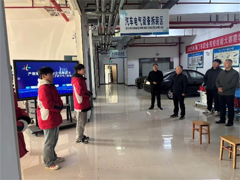 赵军主任一行先后深入汽车制造与维修、机械设计与制造、电子电器与集成电路、教育与体育等四个赛道(项)的集训现场,实地察看训练环境、设备运行、材料准备及训练组织实施情况。每到一处,他们都与参赛学生和指导教师进行亲切交流,认真听取各赛道训练方案汇报,详细了解各队在训练进度、技术难点、后勤保障等方面的情况,并对师生展现出的积极备赛状态和学校有序的组织工作给予了充分肯定。