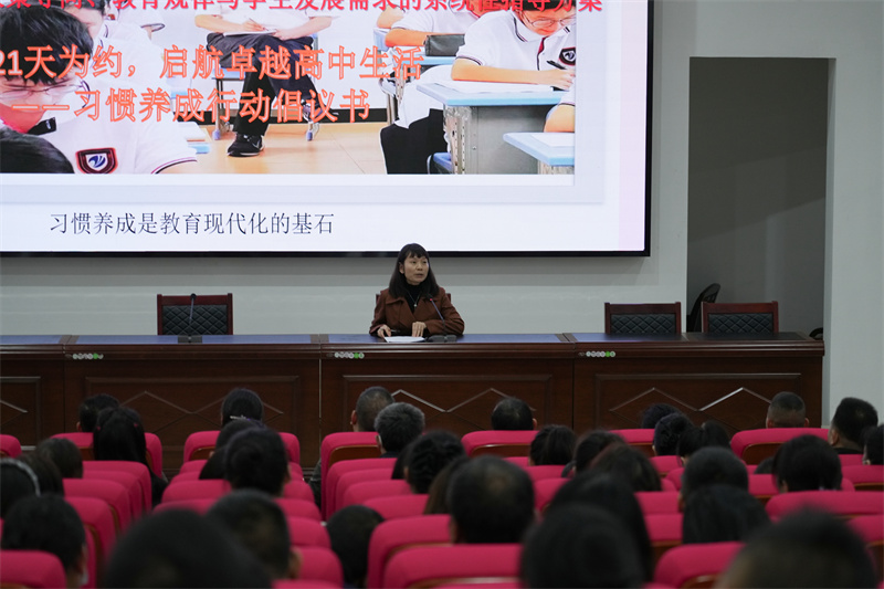 随后,学校教务处覃主任指出高一是学生行为习惯养成的关键时期,家校双方的紧密配合至关重要,并发起了高一年级学生21天行为习惯养成倡议。