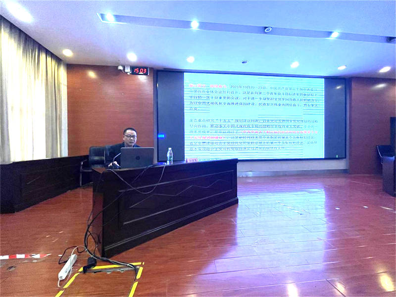 报告指出,党的二十届四中全会是在向第二个百年奋斗目标进军新征程上举行的一次十分重要的会议。全会重点研究“十五五”规划建议问题,审议通过的《中共中央关于制定国民经济和社会发展第十五个五年规划的建议》,作为新时代以来党中央制定的第三个五年规划建议,是确保基本实现社会主义现代化取得决定性进展的纲领性文件。刘良军教授结合历史脉络与时代背景,对全会召开的重大意义进行了深入阐释,让教职工深刻认识到全会精神对教育事业发展的指引价值。